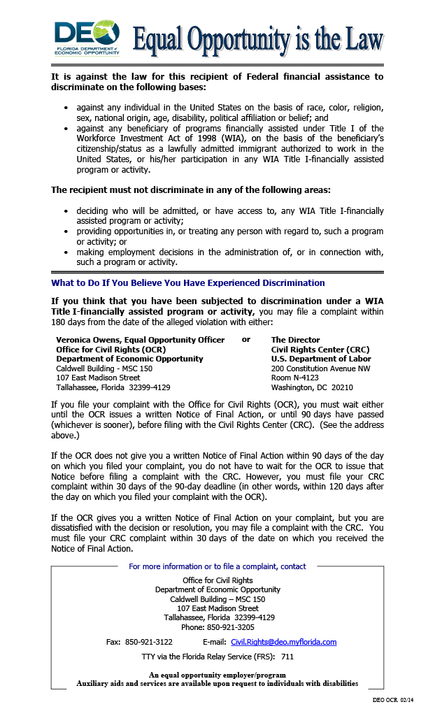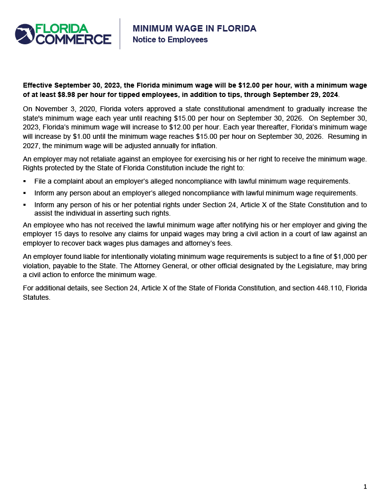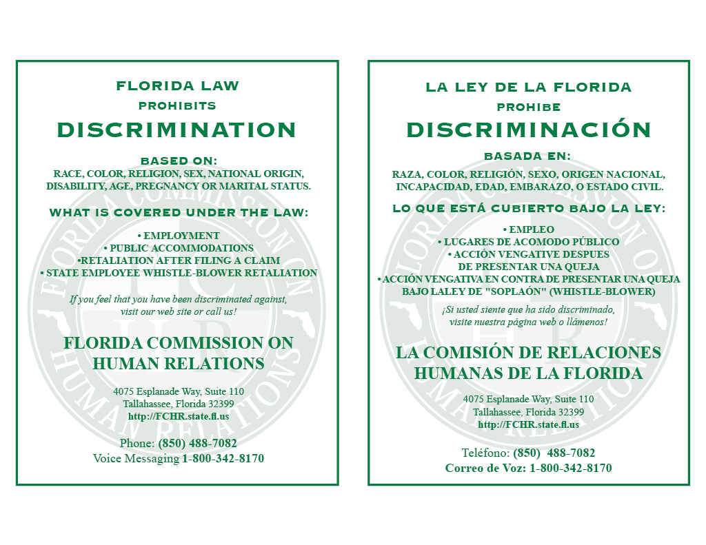 State Labor Law PostersFlordiaOn this pageFlordia State Labor Law PostersFlordia State Labor Law Posters Minimum Wage Equal Opportunity Discrimation Reemployment Assistance Fraud Notice