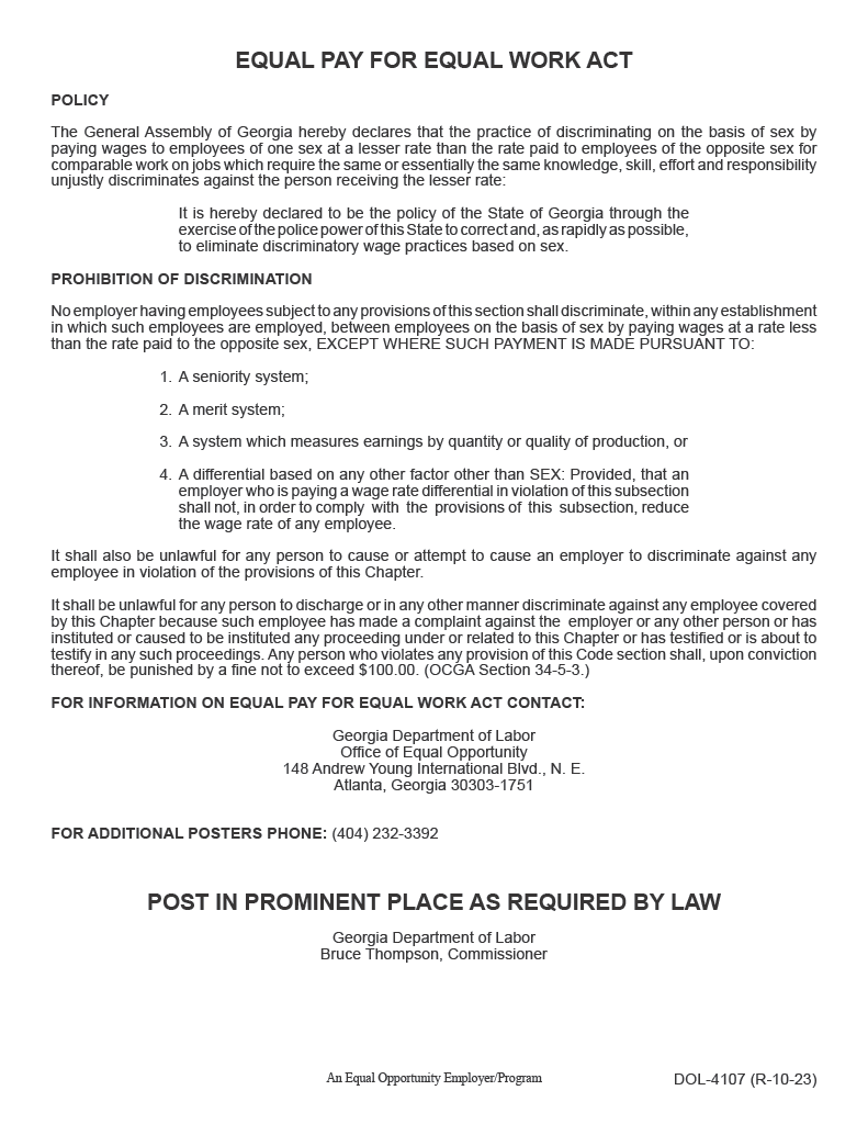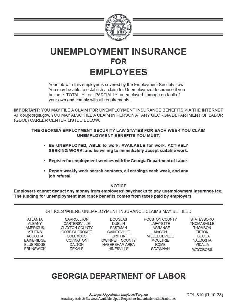 State Labor Law PostersGeorgiaOn this pageGeorgia State Labor Law PostersGeorgia State Labor Law Posters Equal Pay Worker's Compensation Managed Care Unemployment Insurance Notice Unemployment Insurance for Employees