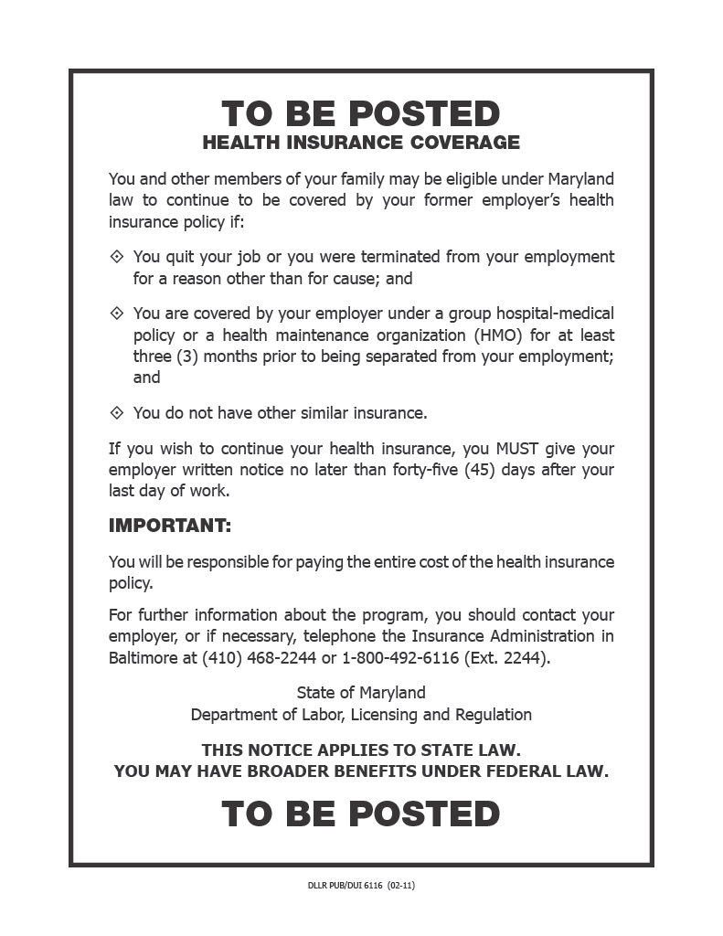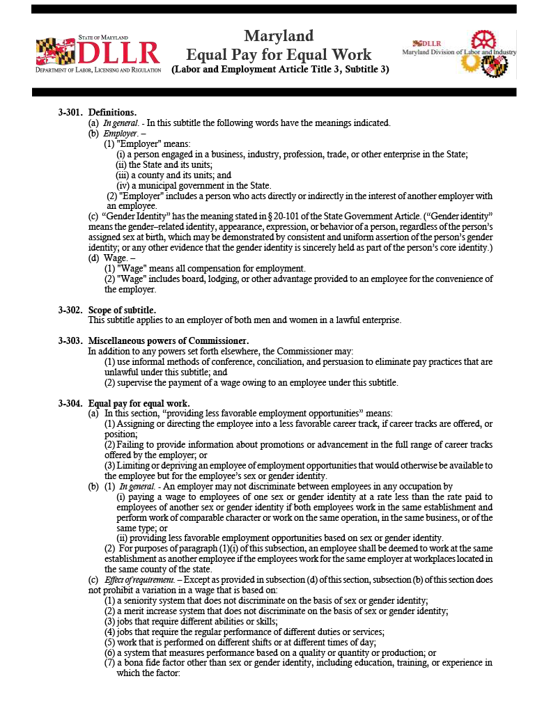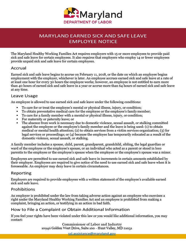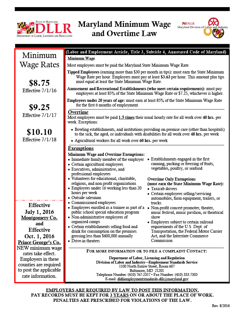 State Labor Law PostersMarylandOn this pageMaryland State Labor Law PostersMaryland State Labor Law Posters Minimum Wage and Overtime Worker's Compensation Employment Discrimation is Unlawful Healthcare Insurance Coverage Pregnant and Working Sick and Safe Leave Equal Pay Sick Leave
