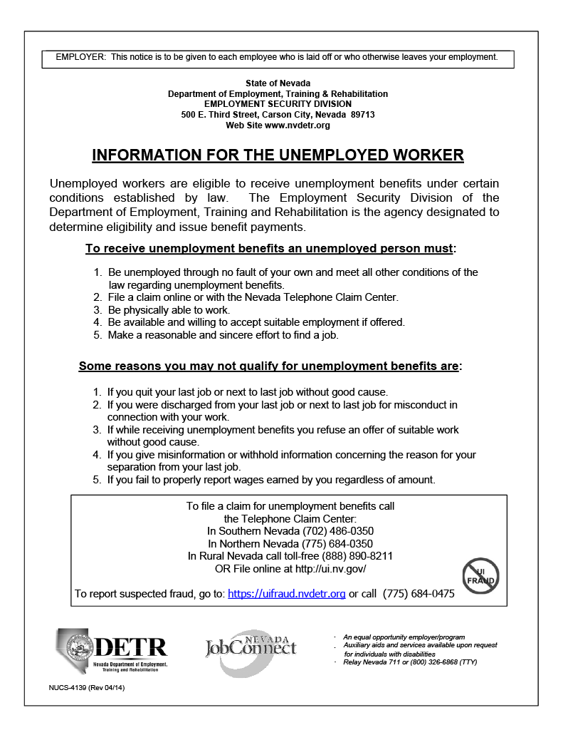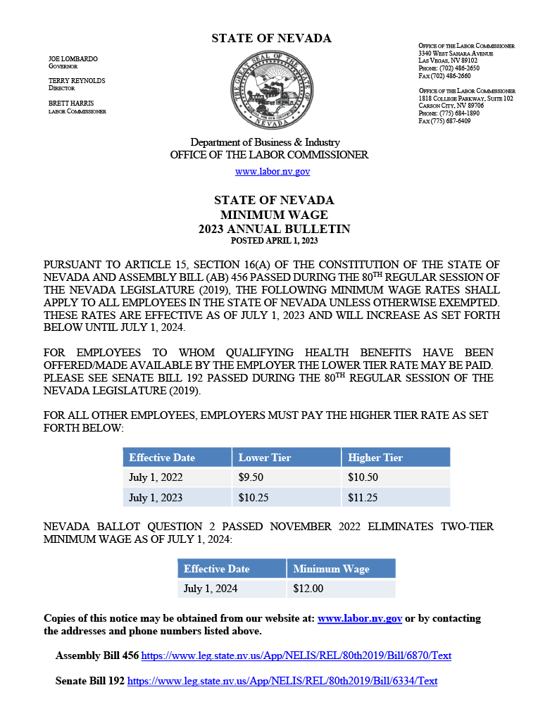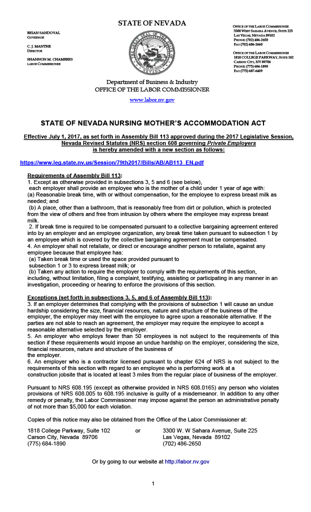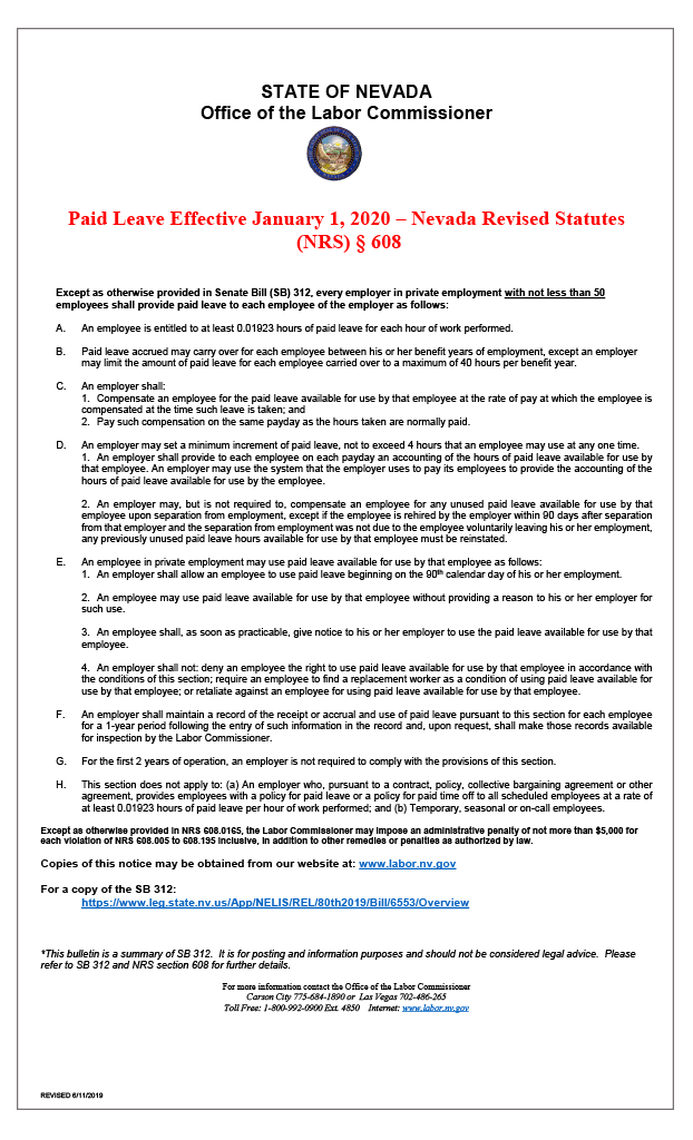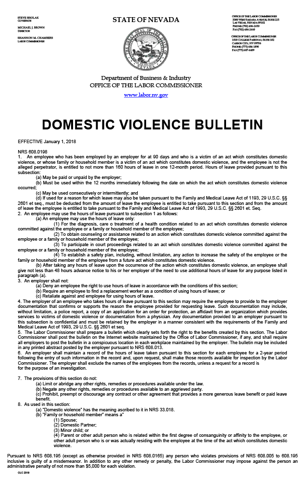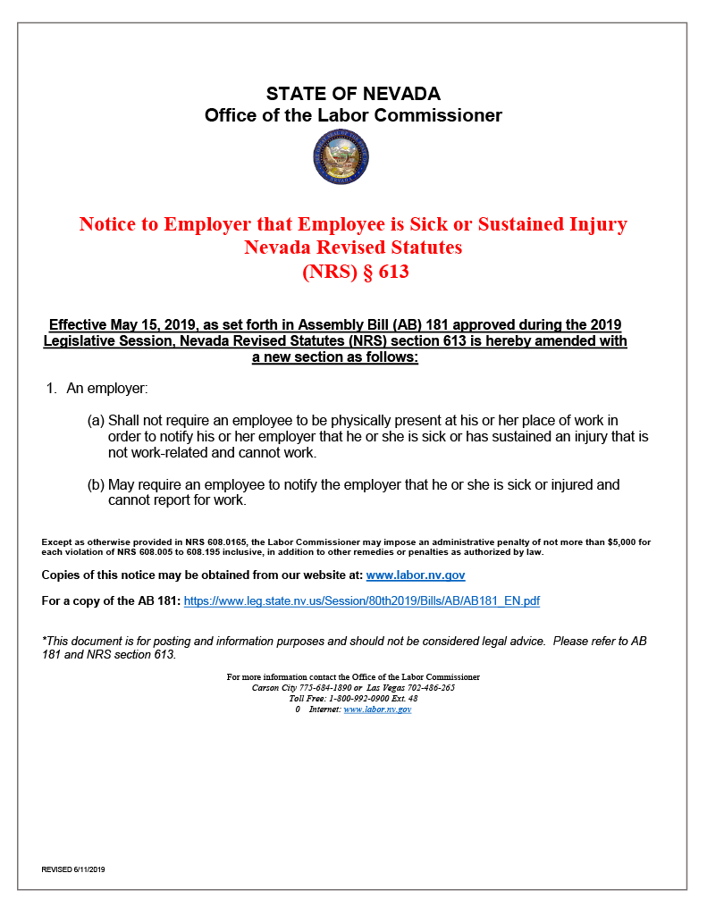 State Labor Law PostersNevadaOn this pageNevada State Labor Law PostersNevada State Labor Law Posters Equal Rights Paid Sick Leave Minimum Wage Rights Domestic Violence Nursing Mothers Accommodation Unemployed Workers Notice of Sick or Injury