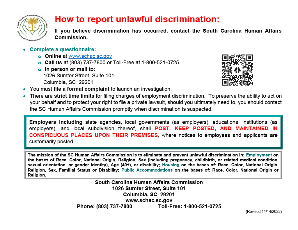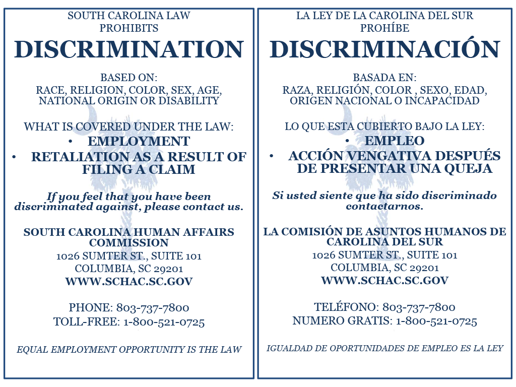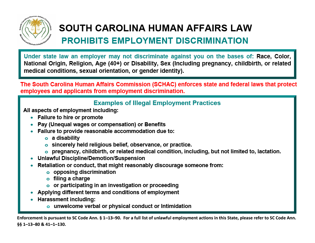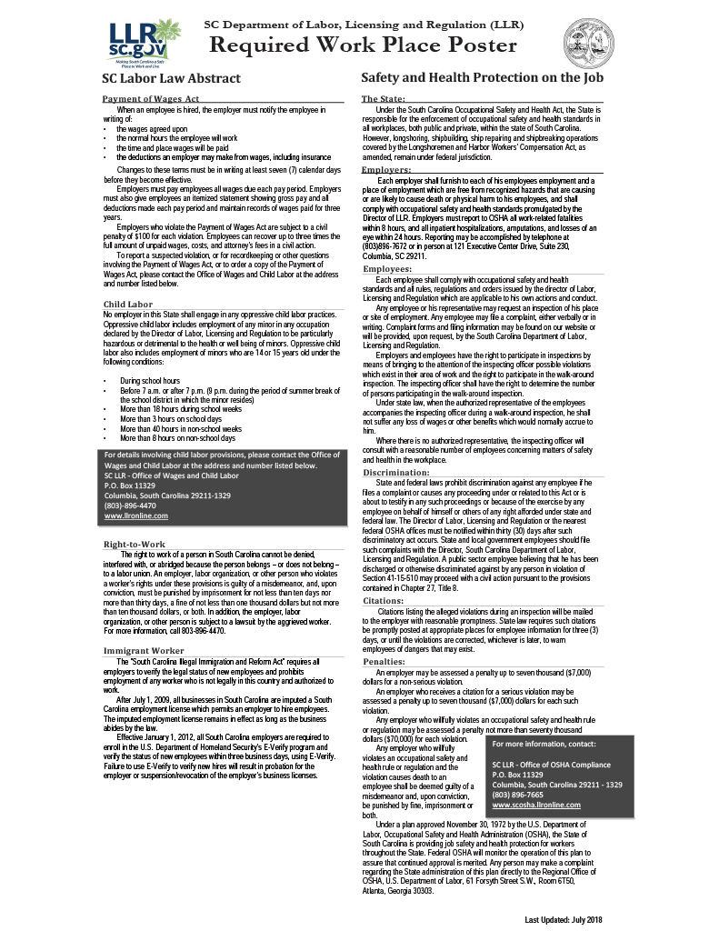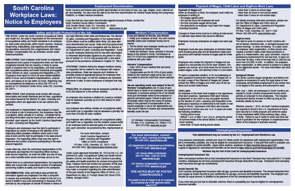 State Labor Law PostersSouth CarolinaOn this pageSouth Carolina State Labor Law PostersSouth Carolina State Labor Law Posters Labor Law Compliance Safety and Health Workspace Discrimation