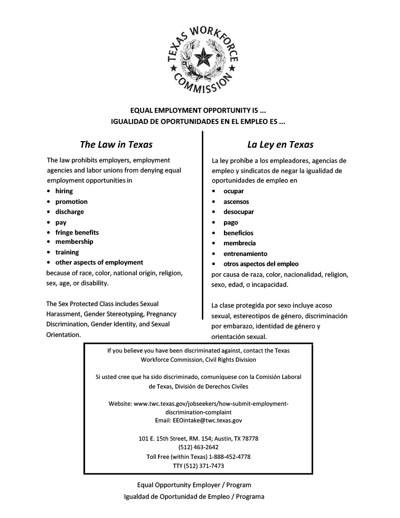 State Labor Law PostersTexasOn this pageTexas State Labor Law PostersTexas State Labor Law Posters Worker's Compensation Equal Opportunity Workplace Violence