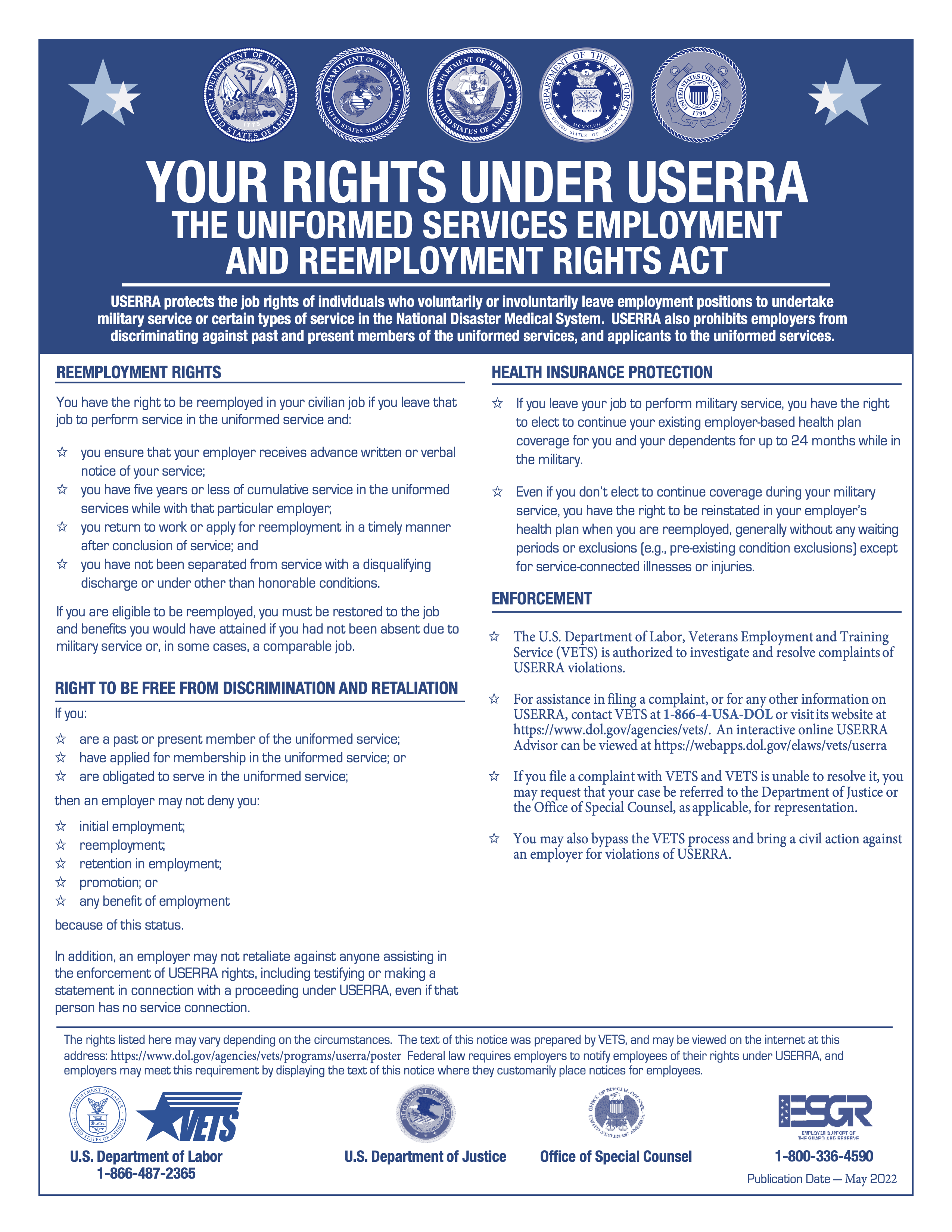 State Labor Law PostersUSERRAOn this pageUniformed Services Employment and Reemployment Rights Act ("USERRA") Labor Law PostersUniformed Services Employment and Reemployment Rights Act State Labor Law Posters Download the 2024 USERRA Poster