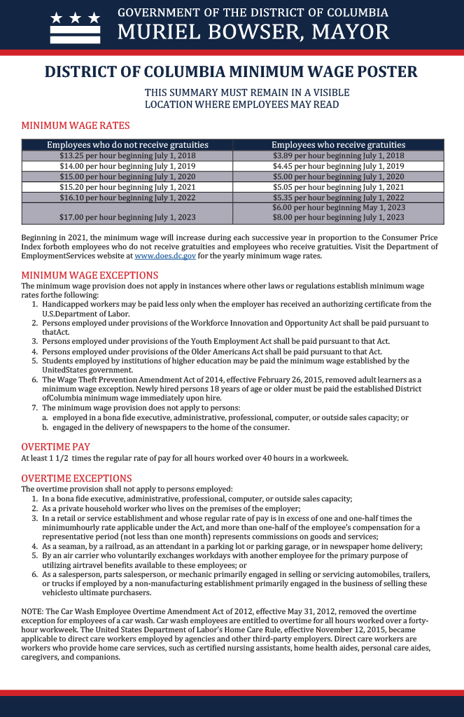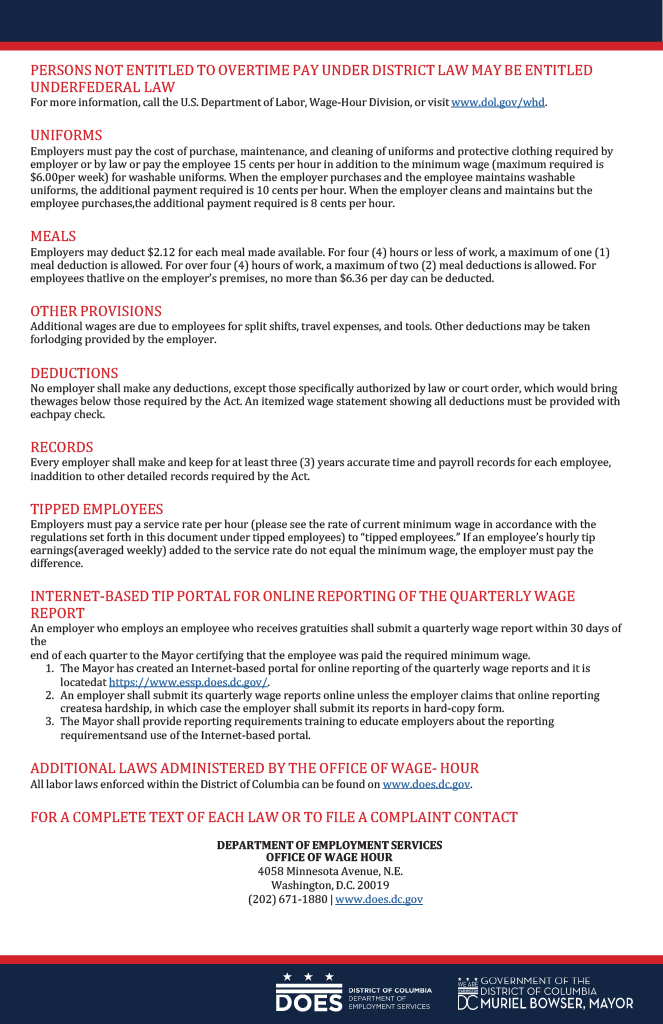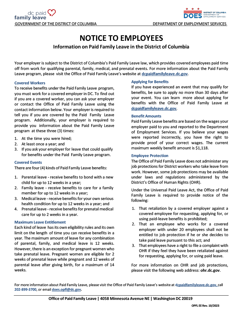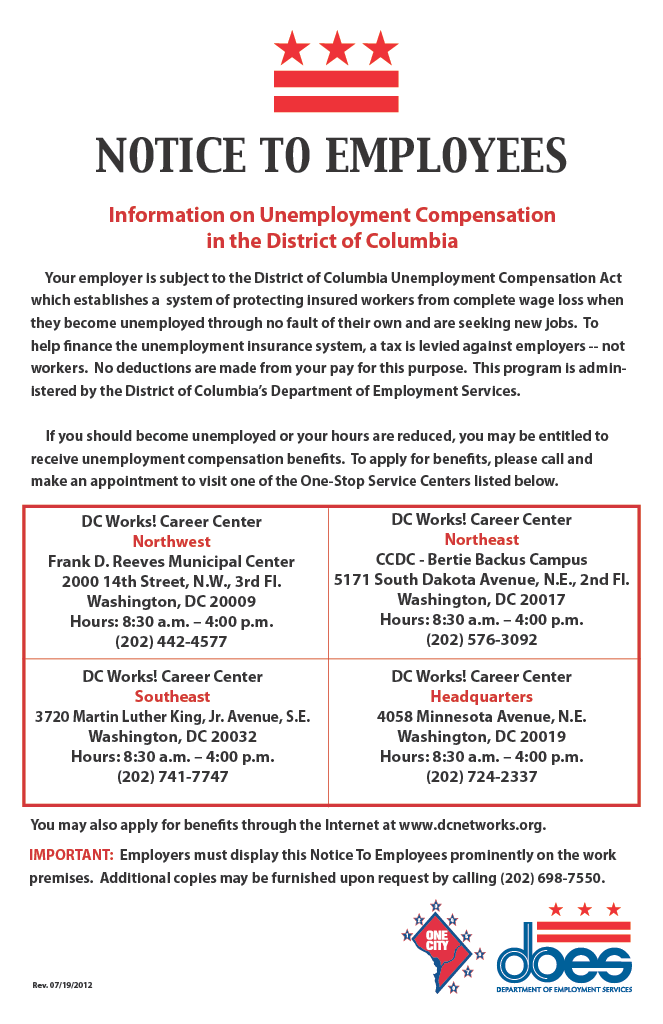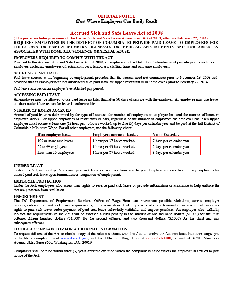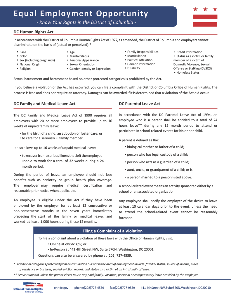 State Labor Law PostersWashington, DCOn this pageWashington, DC Labor Law PostersWashington, DC State Labor Law Posters Equal Opportunity Sick and Safe Leave Paid Family Leave Parental Leave Protecting Pregnant Workers Worker's Compensation Unemployment Compensation Minimum Wage Wage Thef Prevention Act
